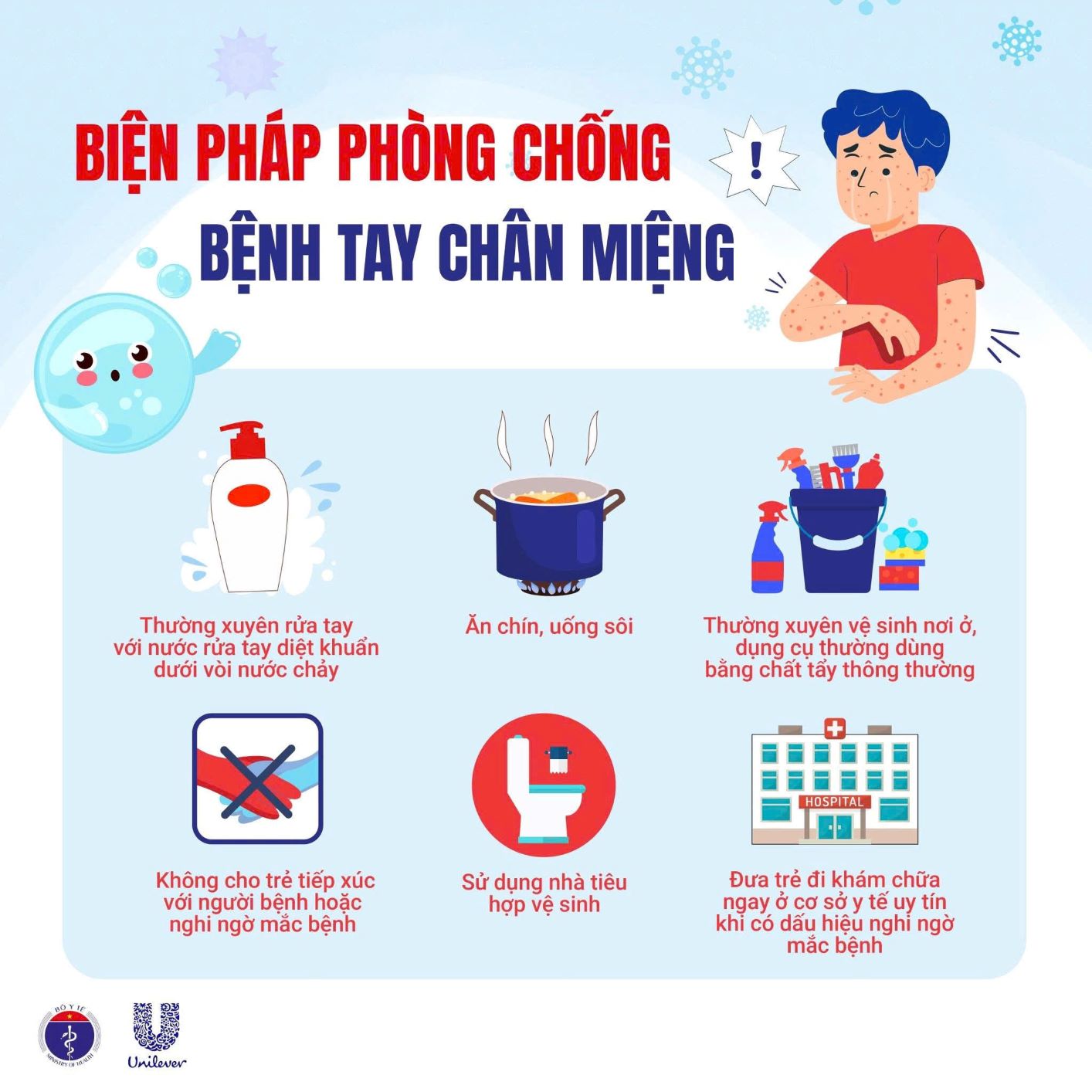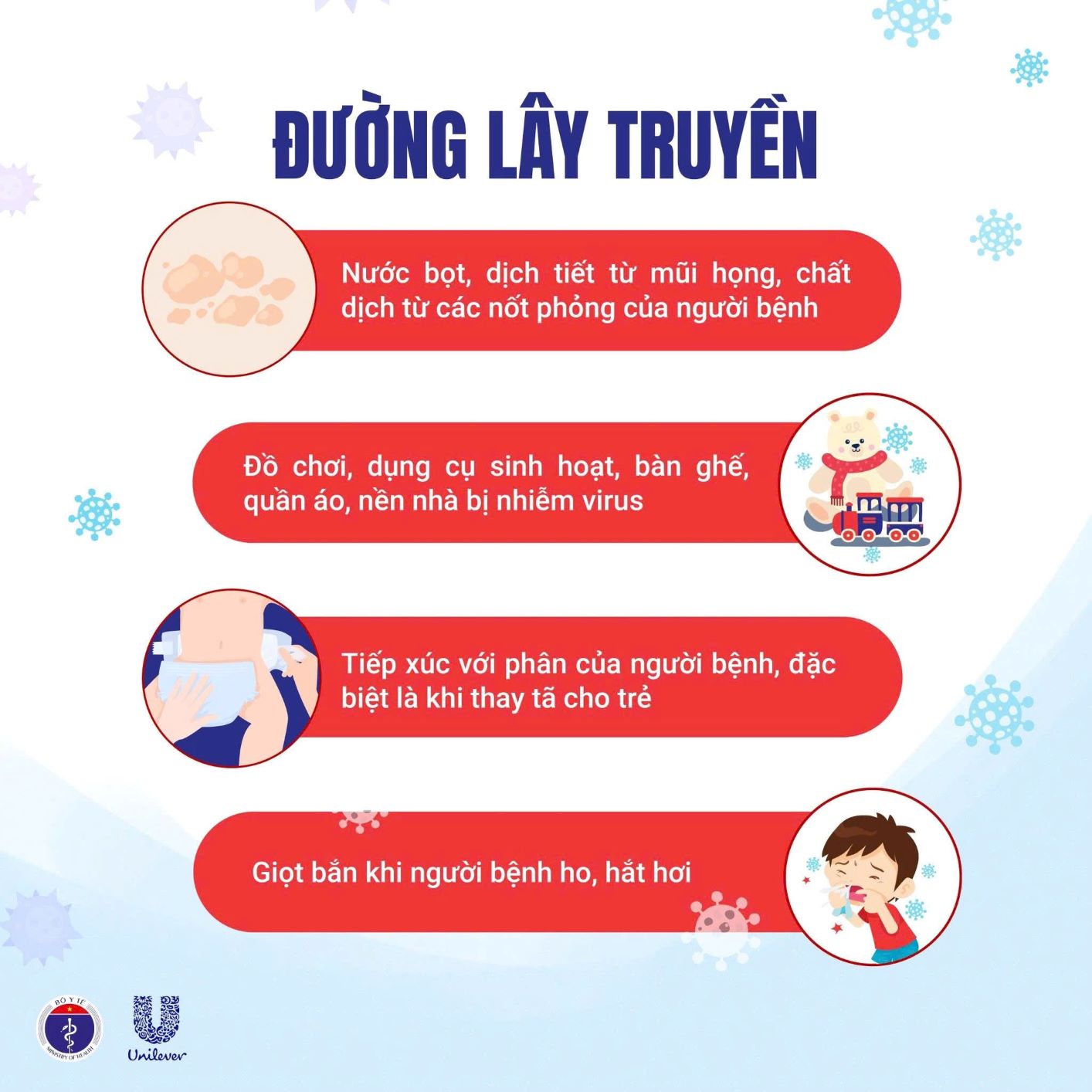 ⚠️ THỜI GIAN LÂY NHIỄM: Từ vài ngày trước khi phát bệnh cho đến khi hết loét miệng và các bóng nước – thường dễ lây nhất trong tuần đầu